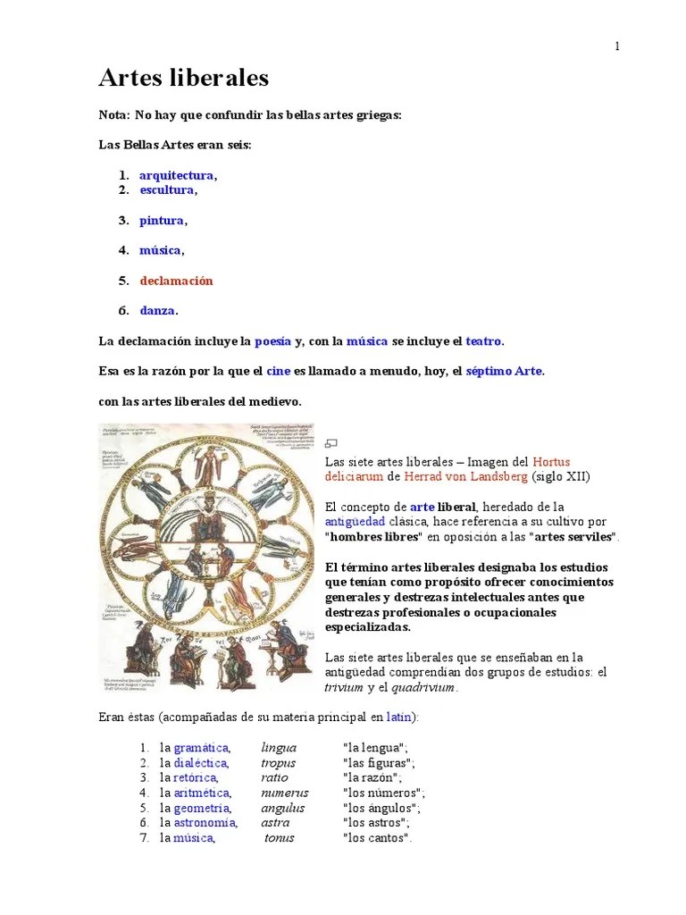 101 Las 7 Artes Liberales Fresco. Incluyendo éstas últimas telar, herrería, guerra, navegación, agricultura, cacería, medicina, y el ars theatrica. Este vídeo fue realizado para una actividad en nuestra universidad sobre las artes liberares y en su defecto lo que es el trivium y el cuadrivium Durante la edad media se dividían las ciencias en dos partes designadas con los nombres de trivium, y quadrivium. Aún los logros a ser dominados por los candidatos a caballeros se fijaron en siete: El término artes liberales designaba los estudios que tenían como propósito ofrecer conocimientos generales y destrezas intelectuales antes que destrezas profesionales u ocupacionales especializadas.
