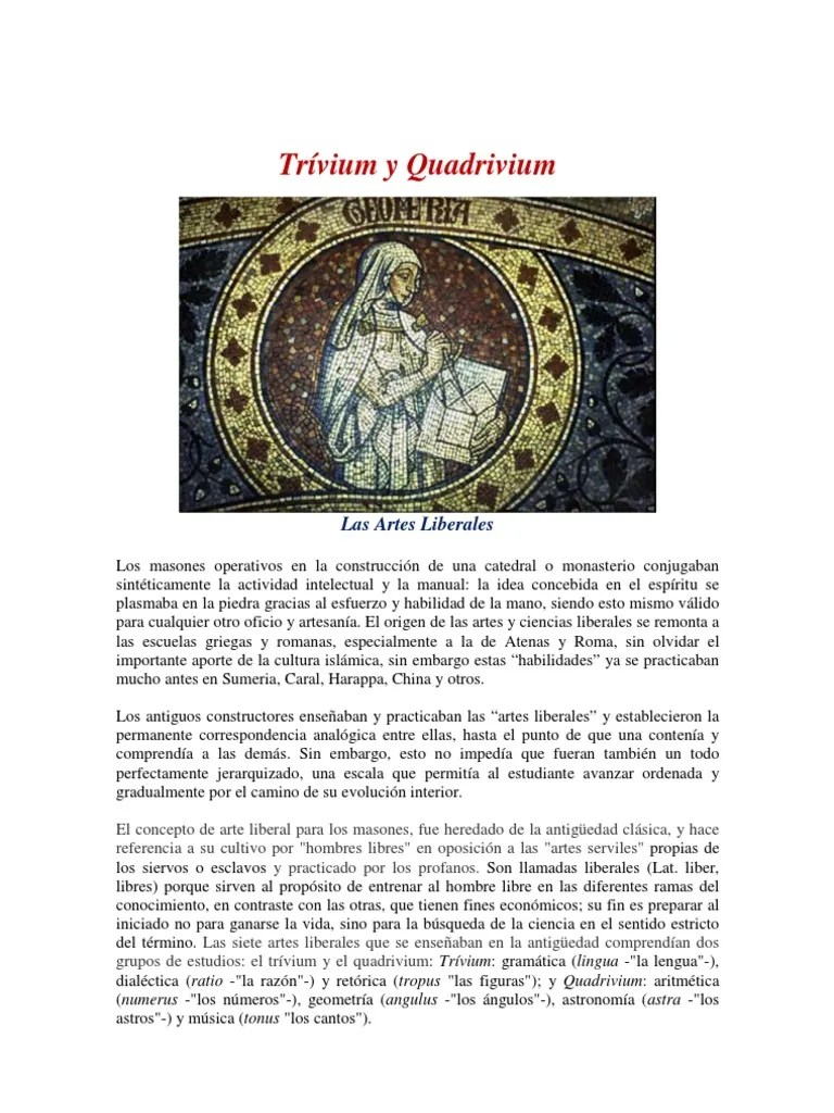 Durante la edad media se dividían las ciencias en dos partes designadas con los nombres de trivium, y quadrivium... 26.07.2020 · #artesliberales #esoterismo #nuevaera #eradeacuario #cosmovisión Este vídeo fue realizado para una actividad en nuestra universidad sobre las artes liberares y en su defecto lo que es el trivium y el cuadrivium 20.05.2019 · el concepto de arte liberal, heredado de la antigüedad clásica, hace referencia a su cultivo por hombres libres en oposición a las artes serviles. El trivium comprendía la gramática, la retórica (y la poesía) y la dialéctica. A éstas se agregaron danza, lucha, y conducción.
