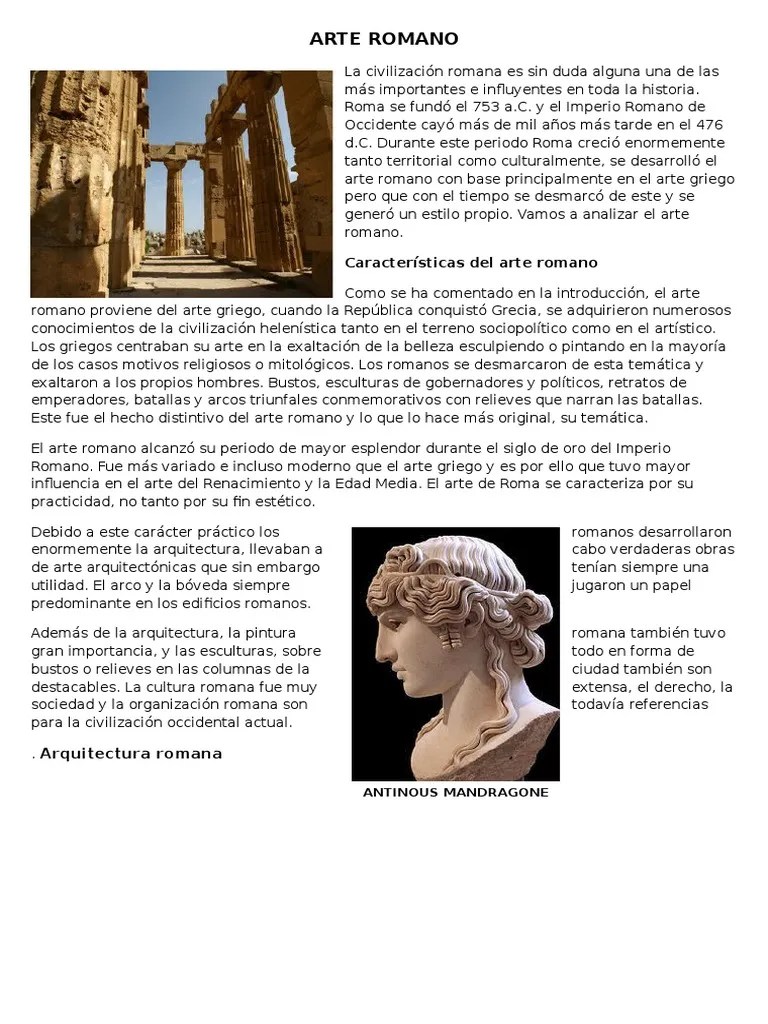Unul european si unul oriental.. La formarea artei romane au contribuit si unele elemente locale din provinciile cucerite. El arte romano hace referencia a las manifestaciones del arte expresivas, las cuales se emplean en la evolución de la cultura romana, que se ha ido expandiendo por otros territorios, las cuales se vieron finalmente influenciadas con el arte griego, siendo el arte romano uno de los. Astfel, mai intai etrucia, in perioada republicana a romei, apoi grecia, in epoca ei imperiala, provincii cu traditii cultural artistice ….. 27.02.2014 · arte religión arte romano tiene su principal manifestación en la arquitectura, tanto religiosa, como civil.